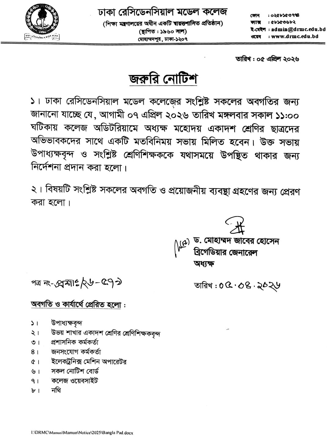 একাদশ শ্রেণির ছাত্রদের অভিভাবকদের সাথে অধ্যক্ষ মহোদয়ের মতবিনিময় সভা সংক্রান্ত জরুরি নোটিশ