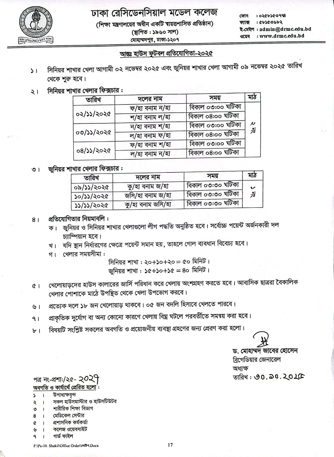 আন্তঃ হাউস ফুটবল প্রতিযোগিতা-২০২৫ এর সময়সূচী