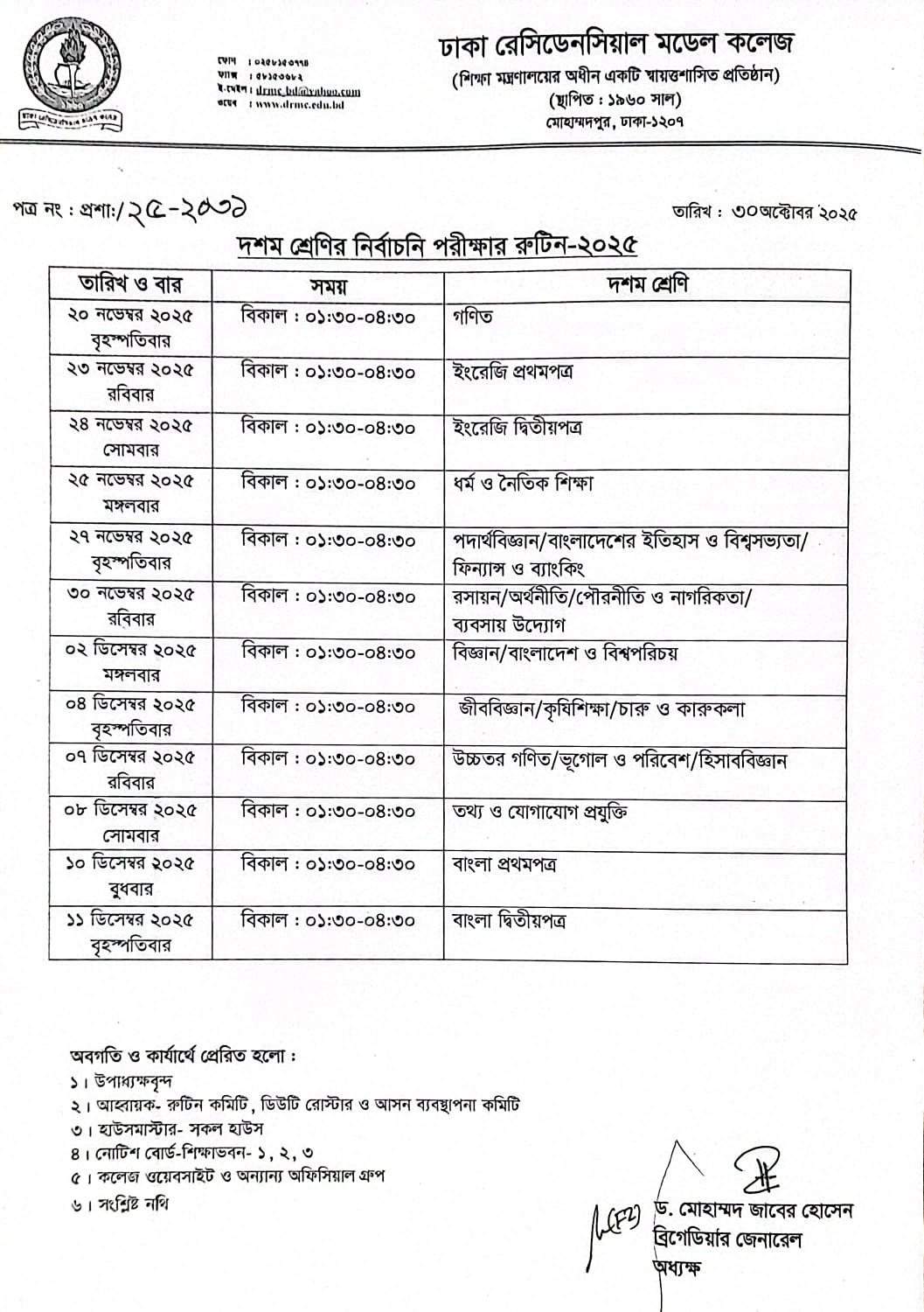 ১০ম শ্রেণির নির্বাচনি পরীক্ষার রুটিন - ২০২৫