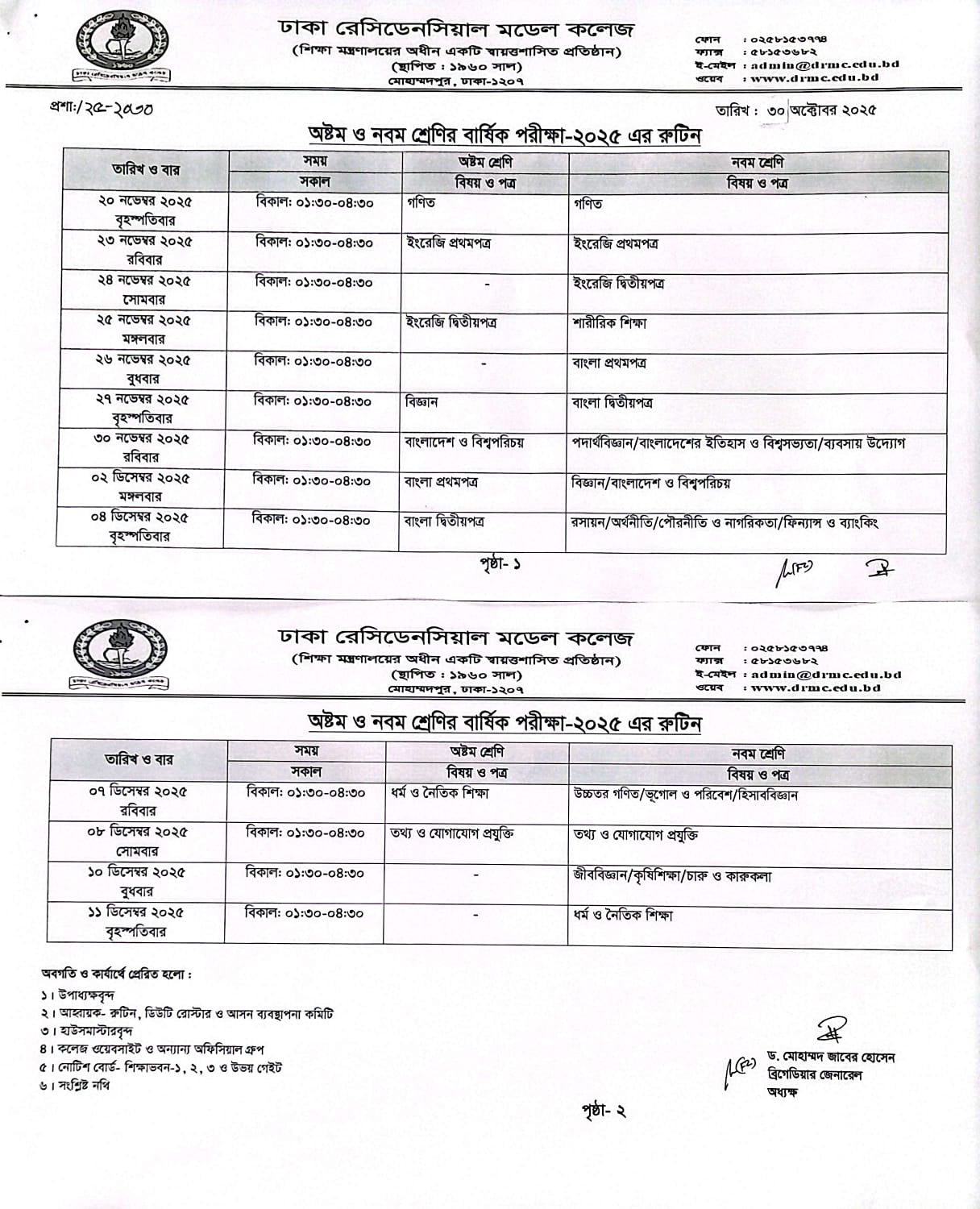 ৮ম ও ৯ম শ্রেণির বার্ষিক পরীক্ষার রুটিন