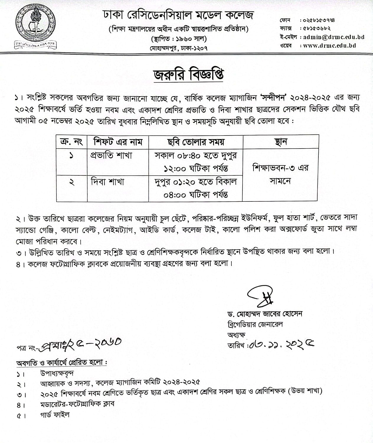 বার্ষিক কলেজ ম্যাগাজিন ‘সন্দীপন’ ২০২৪-২০২৫ এ ভর্তিকৃত শিক্ষার্থীদের ছবি তোলার স্থান ও সময়সূচি