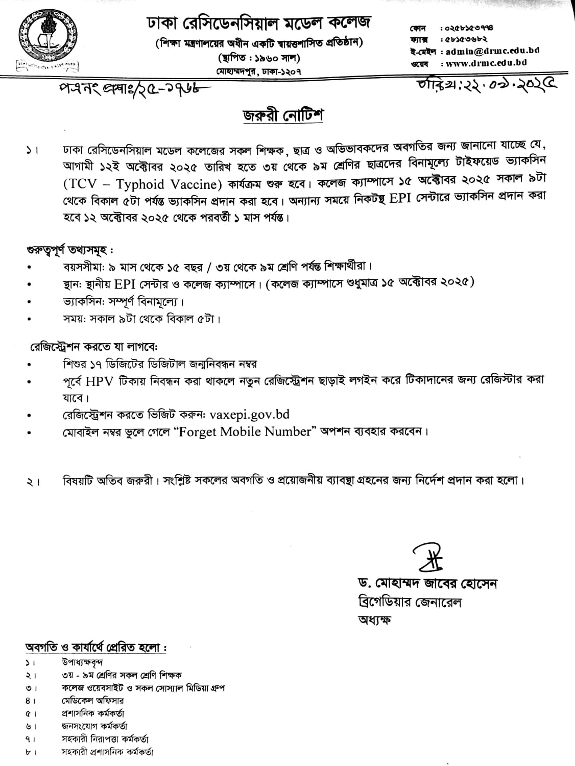 জরুরী নোটিশ (টাইফয়েড ভ্যাকসিন কার্যক্রম প্রসঙ্গে)