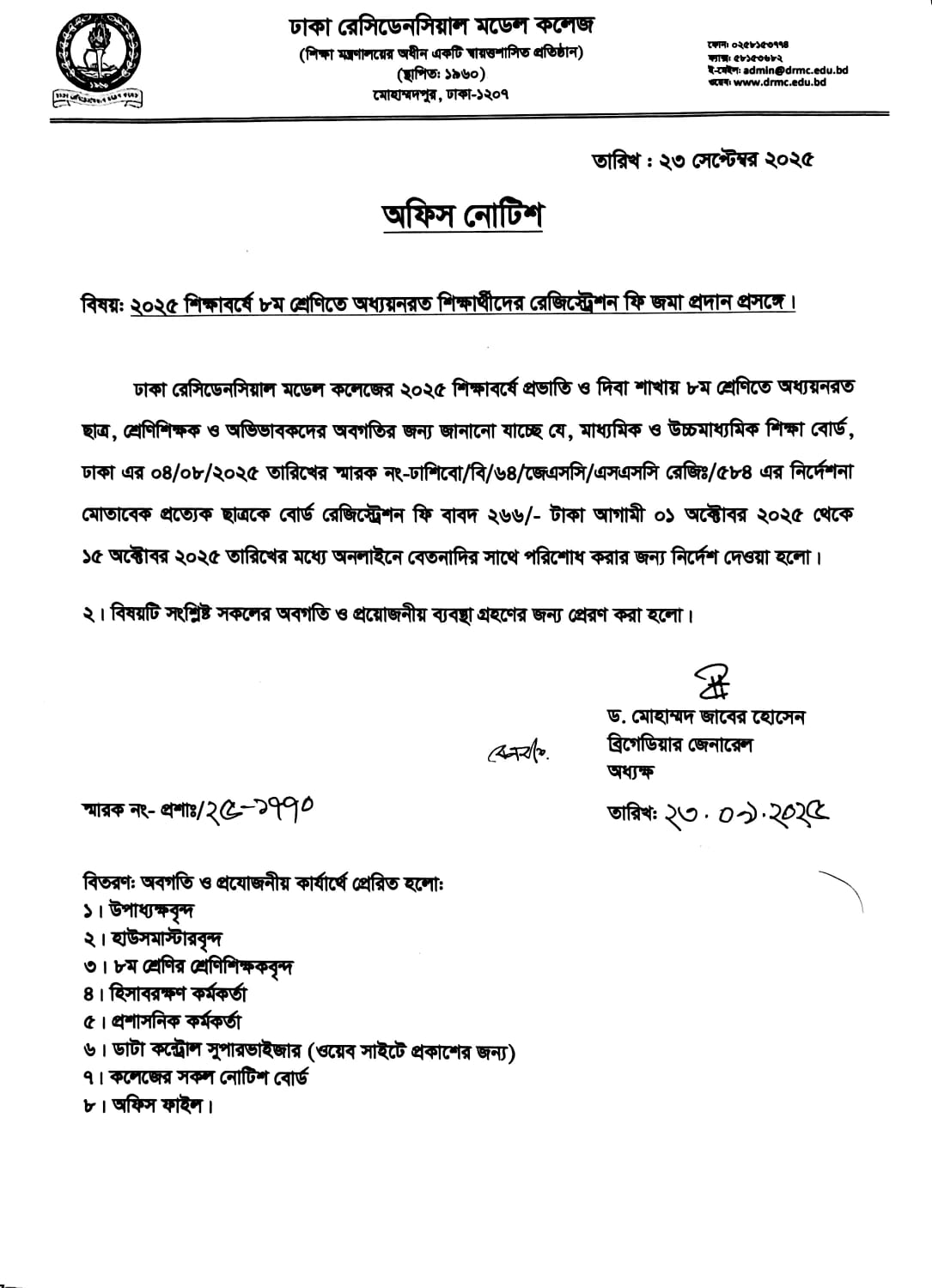 জরুরি নোটিশ (২০২৫ শিক্ষাবর্ষে ৮ম শ্রেণিতে অধ্যয়নরত শিক্ষার্থীদের ফি জমা প্রদান প্রসঙ্গে।)