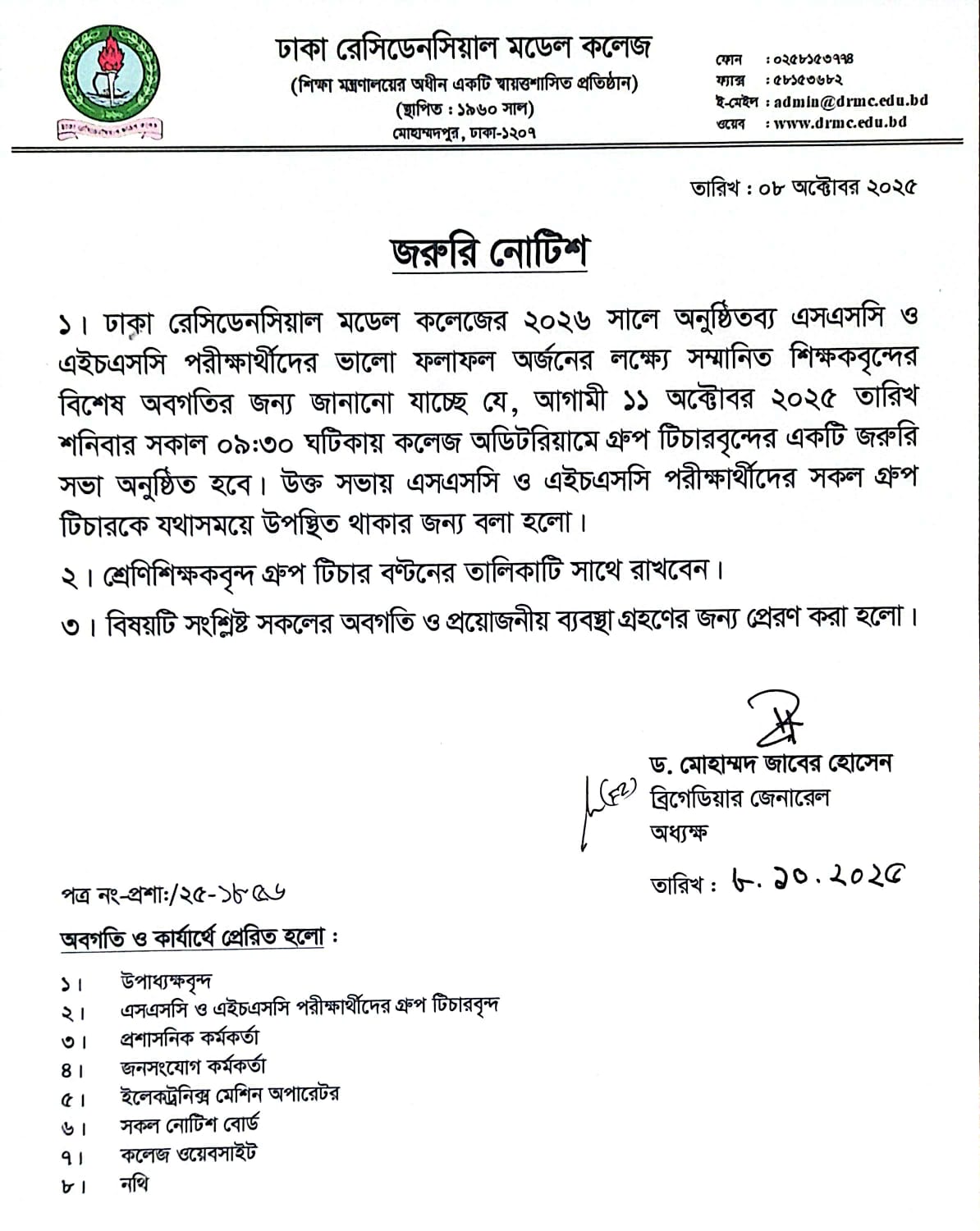 জরুরি নোটিশ (এসএসসি ও এইচএসসি পরীক্ষায় ভালো ফলাফল অর্জনের লক্ষ্যে গ্রুপ টিচারবৃন্দের সভা অনুষ্ঠিত প্রসঙ্গে।)