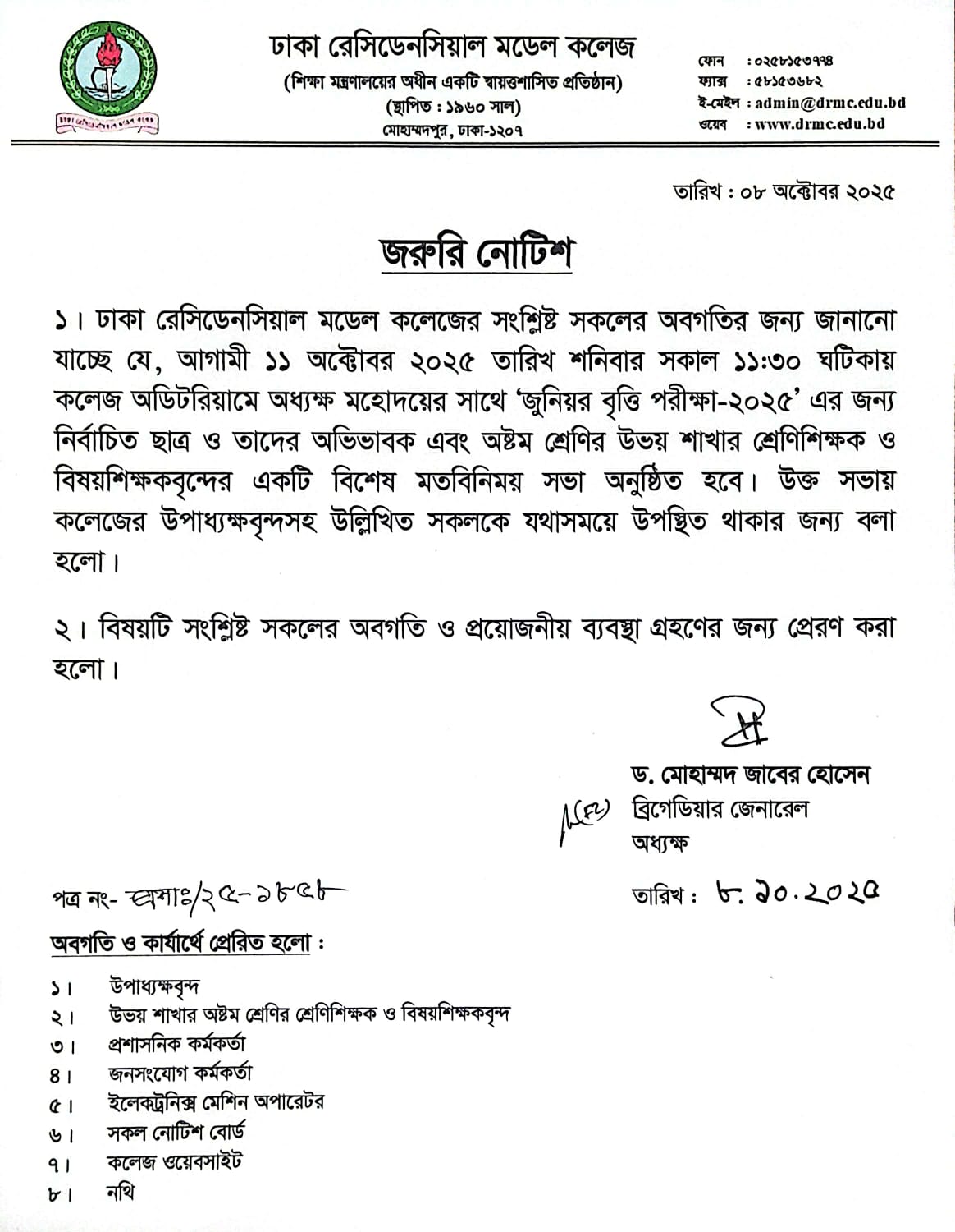 জরুরি নোটিশ (জুনিয়র বৃত্তি পরীক্ষা-২০২৫ এর জন্য নির্বাচিত ছাত্র ও তাদের অভিভাবক এবং অষ্টম শ্রেনির উভয় শাখার শ্রেণিশিক্ষক ও বিষয়শিক্ষকবৃন্দের বিশেষ মতবিনিময় সভা প্রসঙ্গে।)