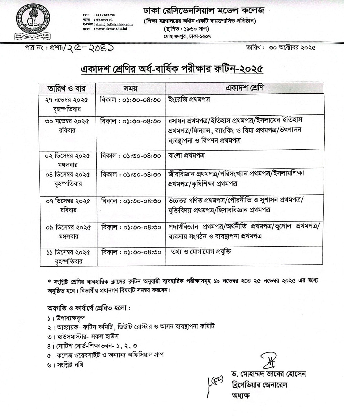 একাদশ শ্রেণির অর্ধ-বার্ষিক পরীক্ষার রুটিন-২০২৫