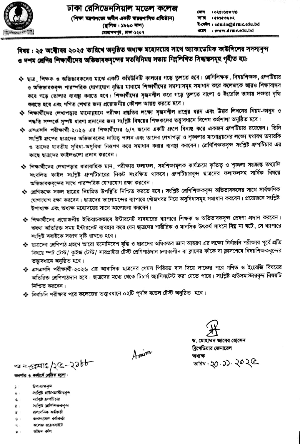 ২৫ অক্টোবর ২০২৫ তারিখে অনুষ্ঠিত অধ্যক্ষ মহোদয়ের সাথে অ্যাকাডেমিক কাউন্সিলের সদস্যবৃন্দ ও দশম শ্রেণির শিক্ষার্থীদের অভিভাবকবৃন্দের মতবিনিময় সভায় সিধান্তসমূহ