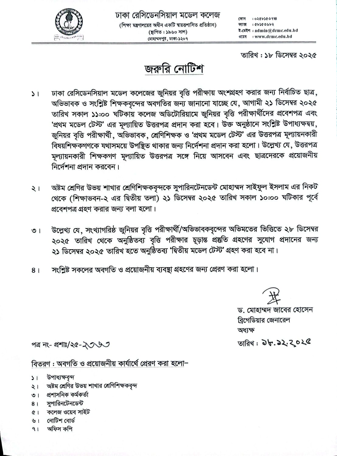 জরুরি নোটিশ ( ঢাকা রেসিডেনসিয়াল মডেল কলেজের জুনিয়র বৃত্তি পরীক্ষায় অংশগ্রহণ করার জন্য নির্বাচিত ছাত্রদের প্রবেশপত্র ও প্রথম মডেল টেস্ট এর মূল্যায়িত উত্তরপত্র প্রদান প্রসঙ্গে।)