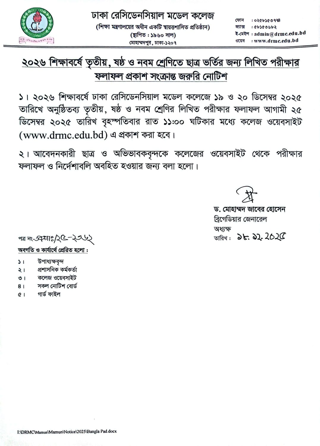 জরুরি নোটিশ (২০২৬ শিক্ষাবর্ষে তৃতীয়, ষষ্ঠ ও নবম শ্রেণিতে ছাত্র ভর্তির জন্য লিখিত পরীক্ষার ফলাফল প্রকাশ প্রসঙ্গে)