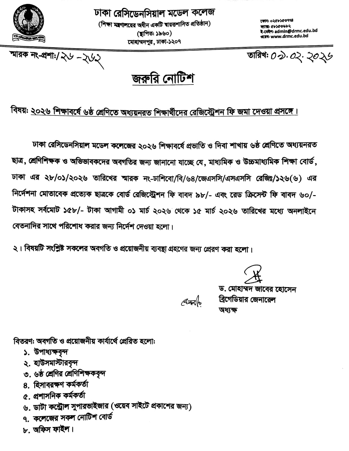 ২০২৬ শিক্ষাবর্ষে ষষ্ঠ শ্রেণীতে অধ্যায়নরত শিক্ষার্থীদের রেজিস্ট্রেশন ফি জমা দেওয়ার সঙ্গে।