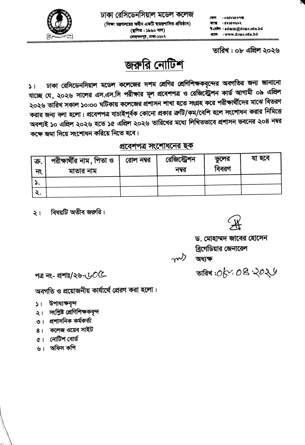 জরুরি নোটিশ ( ২০২৬ সালের এস.এস.সি পরীক্ষার মূল প্রবেশপত্র ও রেজিস্ট্রেশন কার্ড আগামী ০৯ এপ্রিল ২০২৬ তারিখ সকাল ১০:০০ ঘটিকায় কলেজের প্রশাসন শাখায় প্রদান করা হবে।