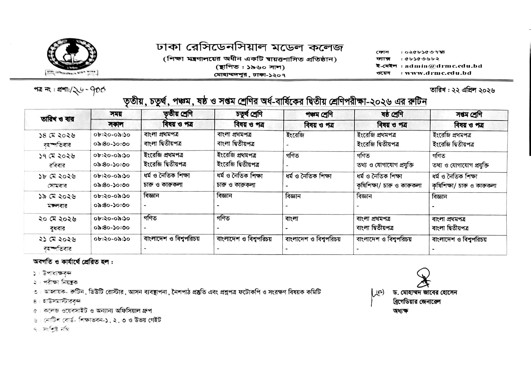 তৃতীয়, চতুর্থ, পঞ্চম, ষষ্ঠ ও সপ্তম শ্রেণির অর্ধ-বার্ষিকের দ্বিতীয় শ্রেণিপরীক্ষা-২০২৬ এর রুটিন