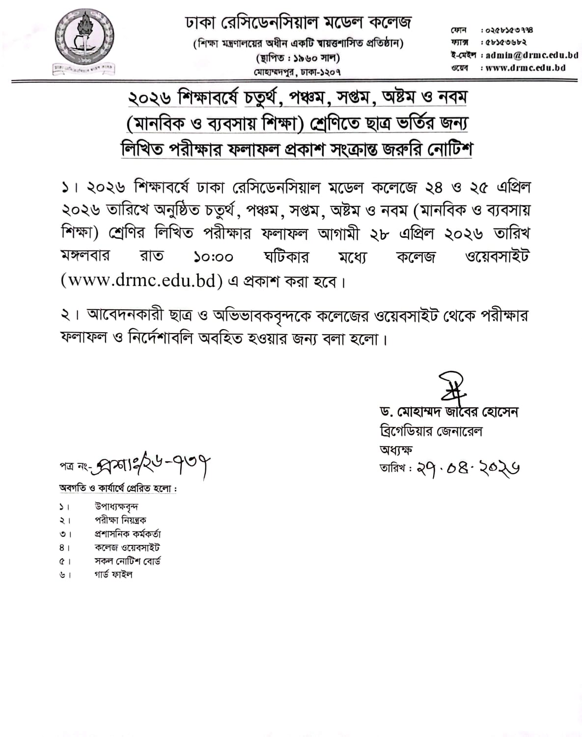 ২০২৬ শিক্ষাবর্ষে চতুর্থ পঞ্চম সপ্তম অষ্টম ও নবম (মানবিক ও ব্যবসায়ী শিক্ষা) শ্রেণীতে ছাত্র ভর্তির জন্য লিখিত পরীক্ষার ফলাফল প্রকাশ সংক্রান্ত জরুরী নোটিশ।