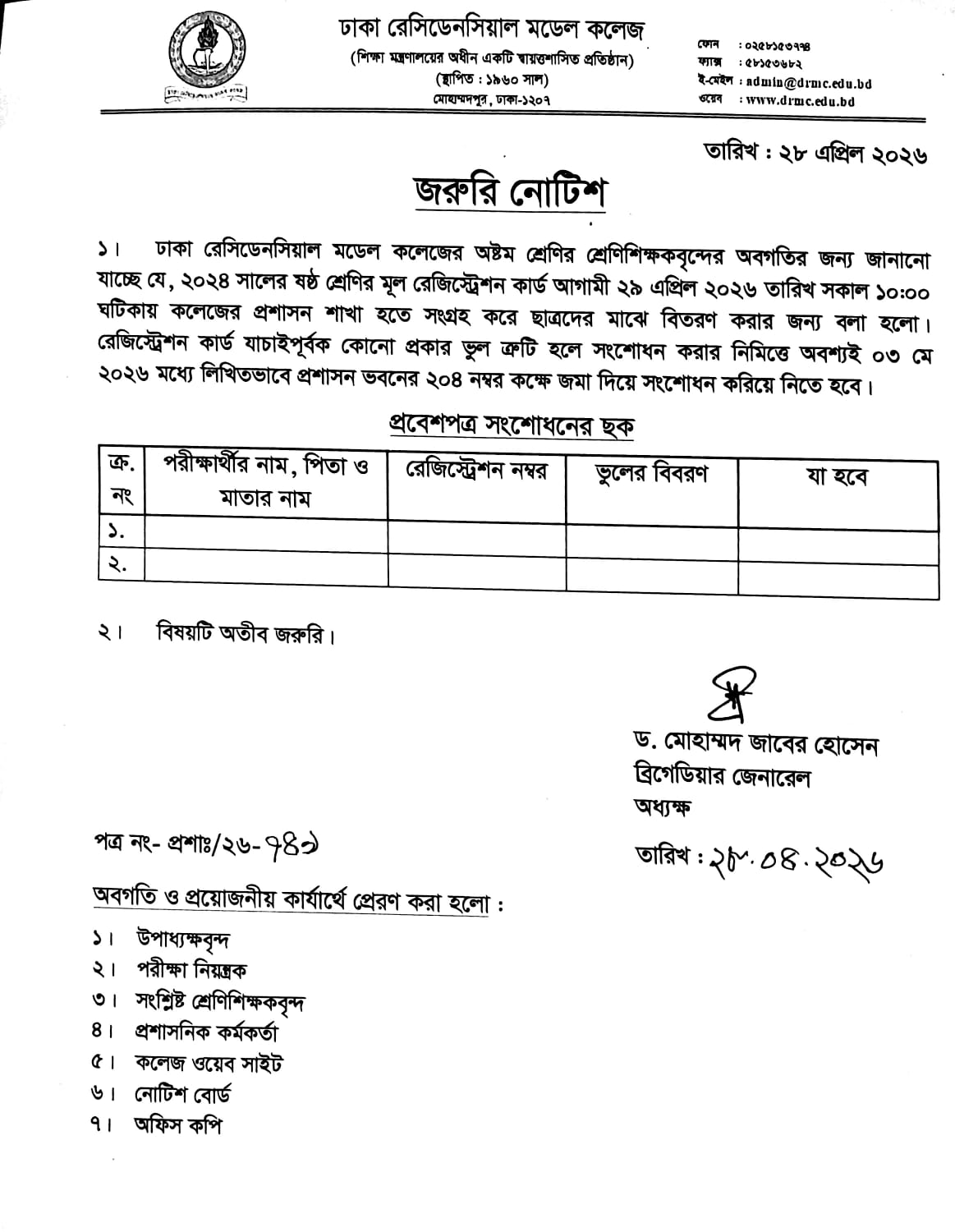 জরুরী নোটিশ (২০২৪ সালের ষষ্ঠ শ্রেণীর রেজিস্ট্রেশন কার্ড ২৯ এপ্রিল ২০২৬ তারিখ সংগ্রহ প্রসঙ্গ)