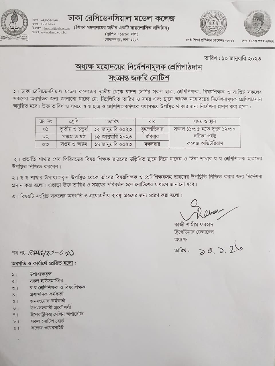 অধ্যক্ষ মহোদয়ের নির্দেশনামূলক শ্রেণিপাঠদান সংক্রান্ত জরুরি নোটিশ-২০২৩
