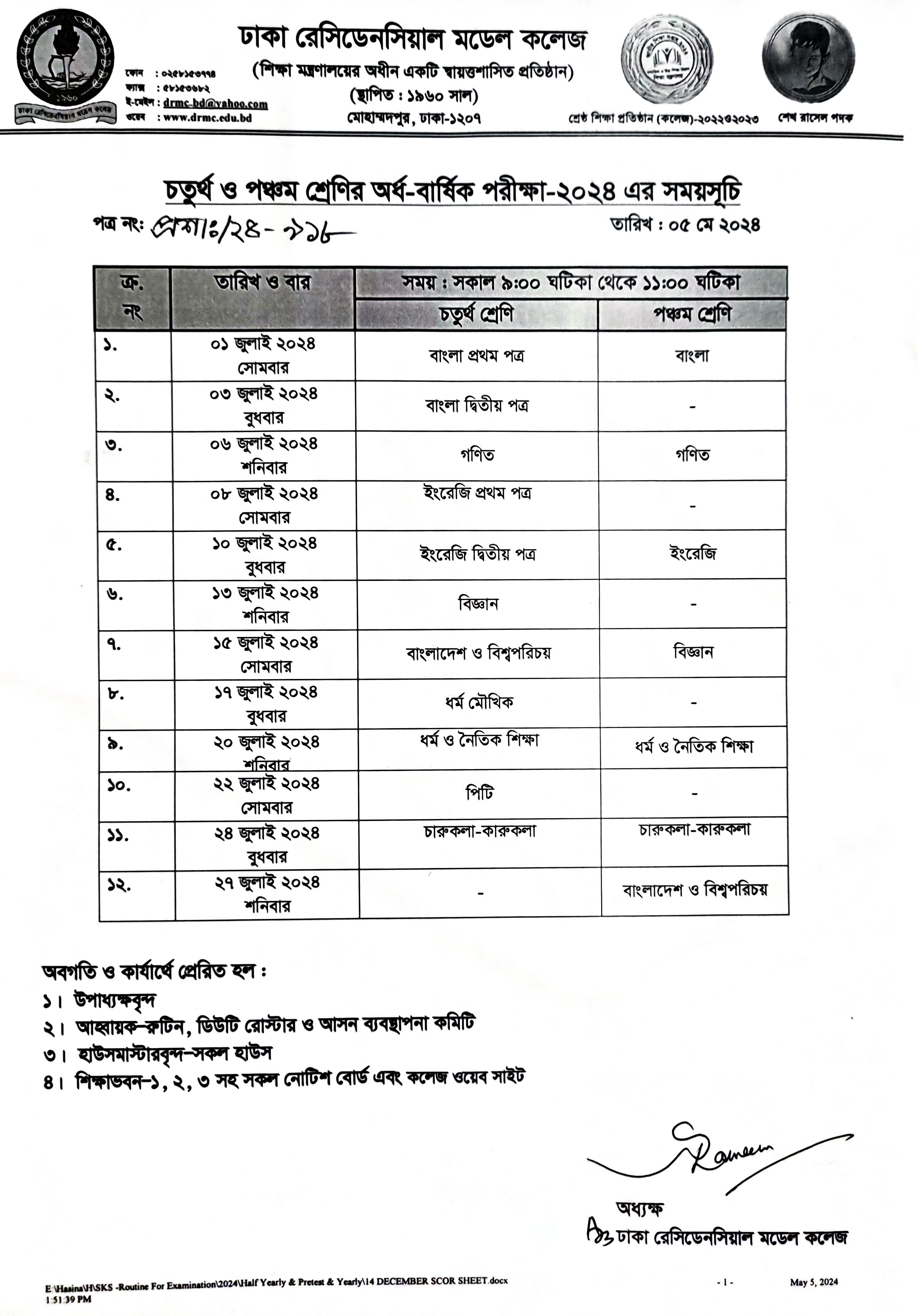 চতুর্থ ও পঞ্চম শ্রেণির অর্ধ-বার্ষিক পরীক্ষা-২০২৪ এর সময়সূচি