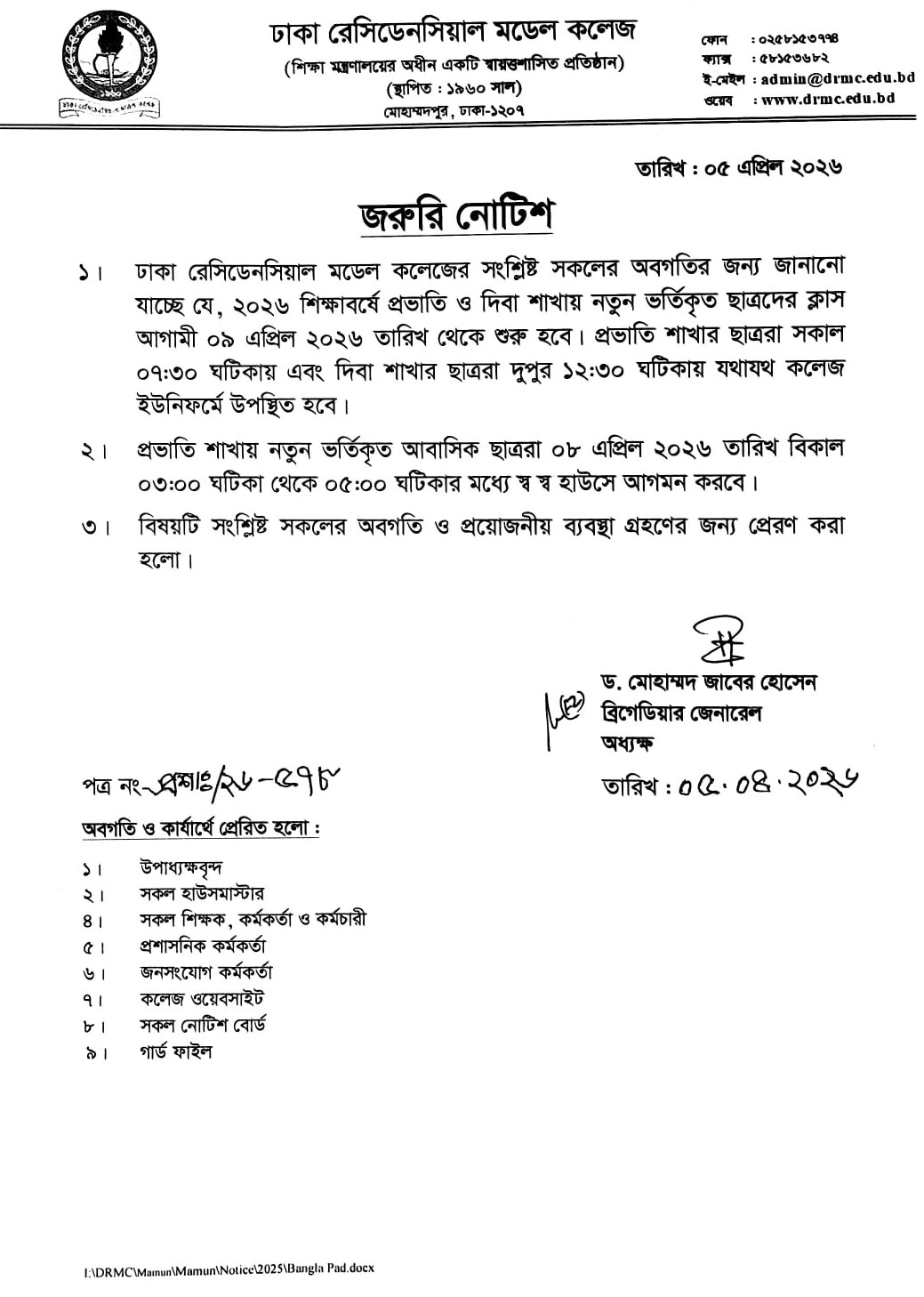 News Title : নতুন ভর্তিকৃত ছাত্রদের শ্রেণিপাঠদানের সময়সূচি ****