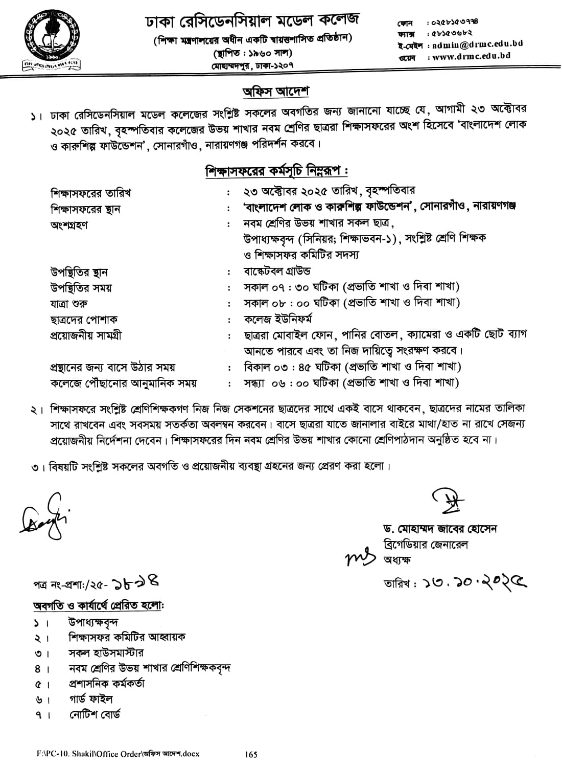অফিস আদেশ (নবম শ্রেণির শিক্ষা সফরের কার্যসূচি)
