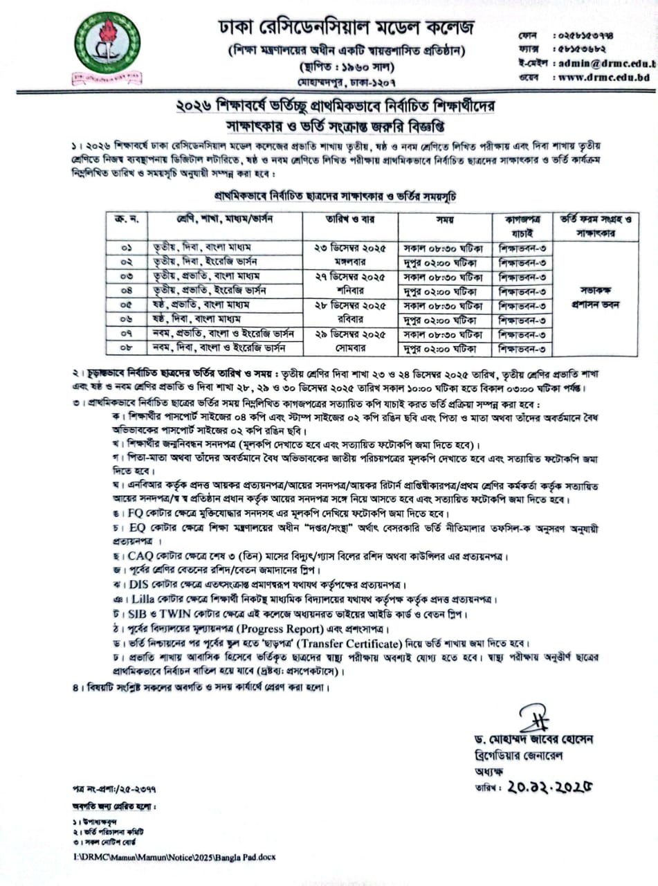 ২০২৬ শিক্ষাবর্ষে ভর্তিচ্ছু প্রাথমিকভাবে নির্বাচিত শিক্ষার্থীদের সাক্ষাৎকার ও ভর্তি সংক্রান্ত জরুরি বিজ্ঞপ্তি