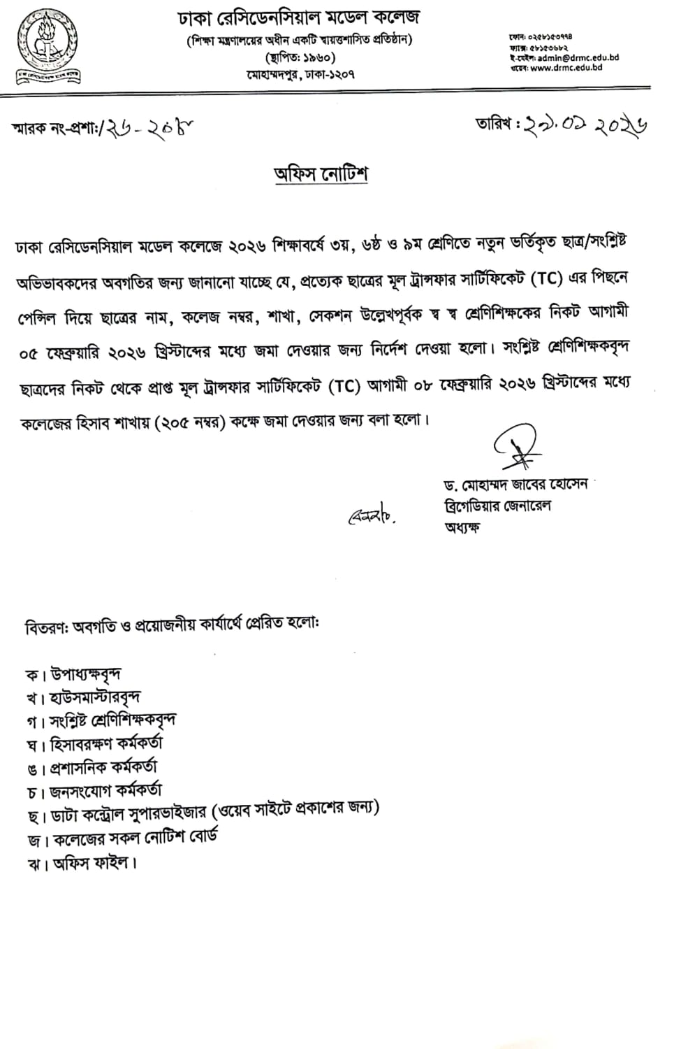 অফিস নোটিশ (মূল ট্রান্সফার সার্টিফিকেট পূরণ ও শ্রেণী শিক্ষকের নিকট জমাদান প্রসঙ্গে)