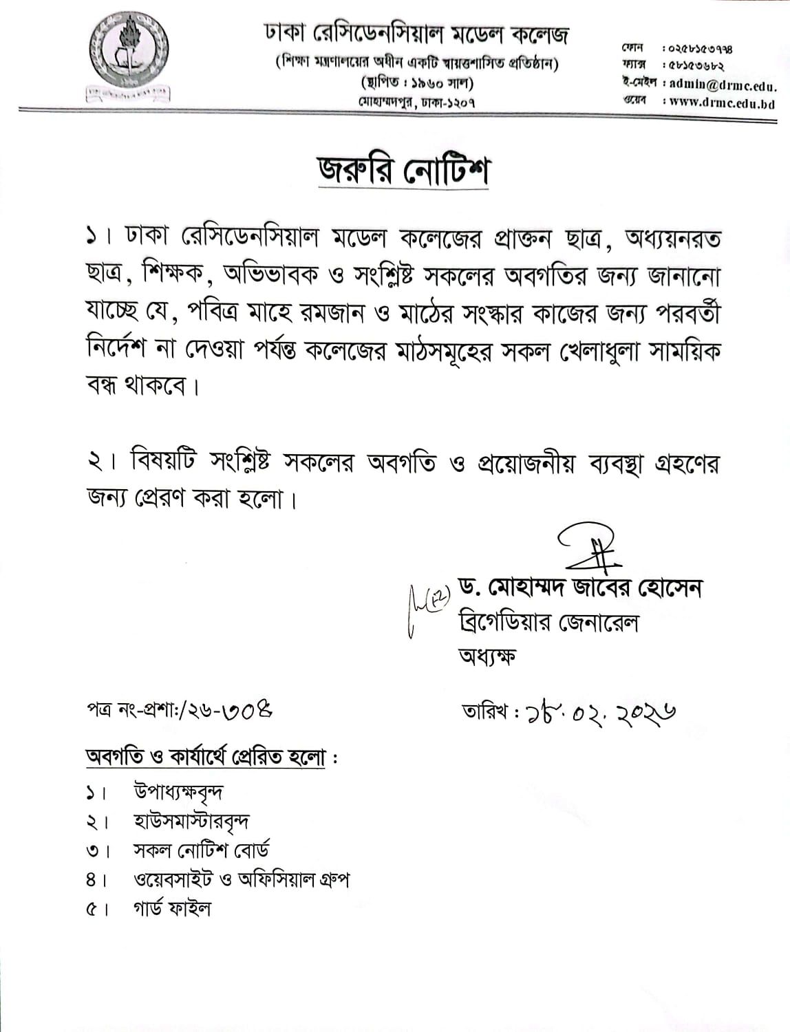 জরুরী নোটিশ (কলেজের মাঠে সংস্কার কাজের জন্য পরবর্তী নির্দেশনা দেওয়া পর্যন্ত সকল খেলাধুলা সাময়িক বন্ধ থাকবে)