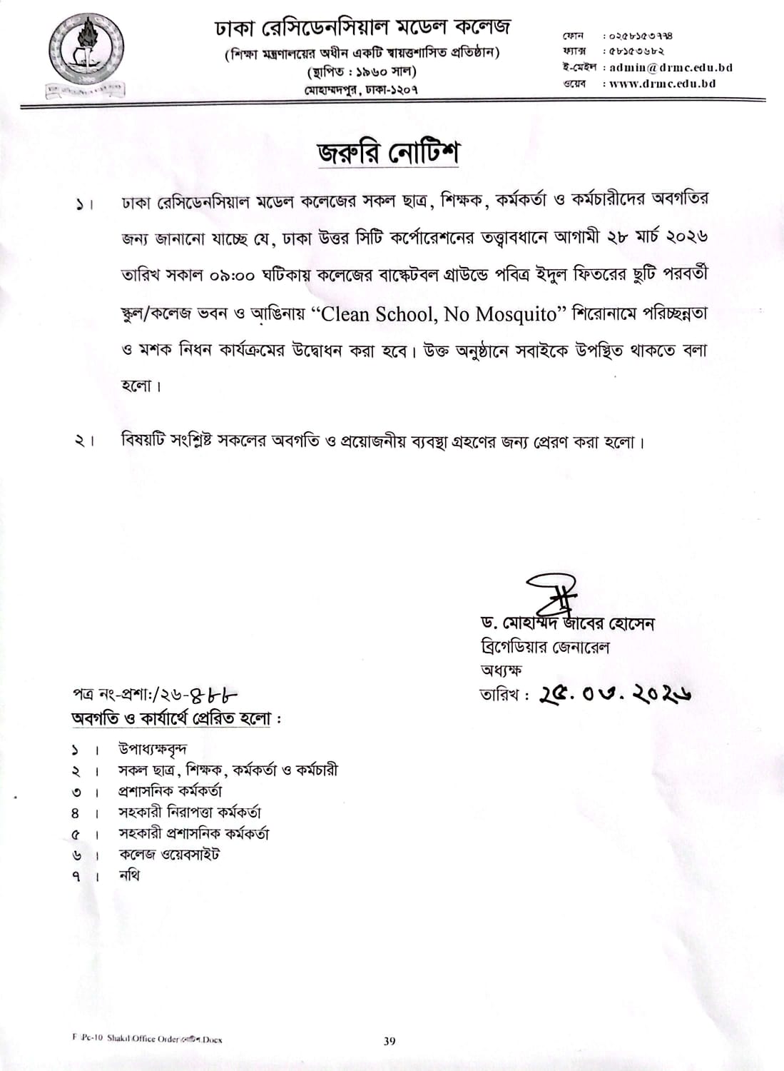 জরুরি নোটিশ (Clean School, No Mosquito শিরোনামে পরিচ্ছন্নতা ও মশক নিধন কার্যক্রম উদ্বোধনে উপস্থিত থাকা প্রসঙ্গে।)