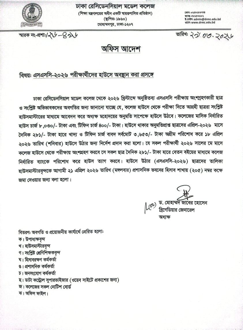 অফিস আদেশ (এসএসসি ২০২৬ পরীক্ষার্থীদের হাউসে অবস্থান করা প্রসঙ্গে)