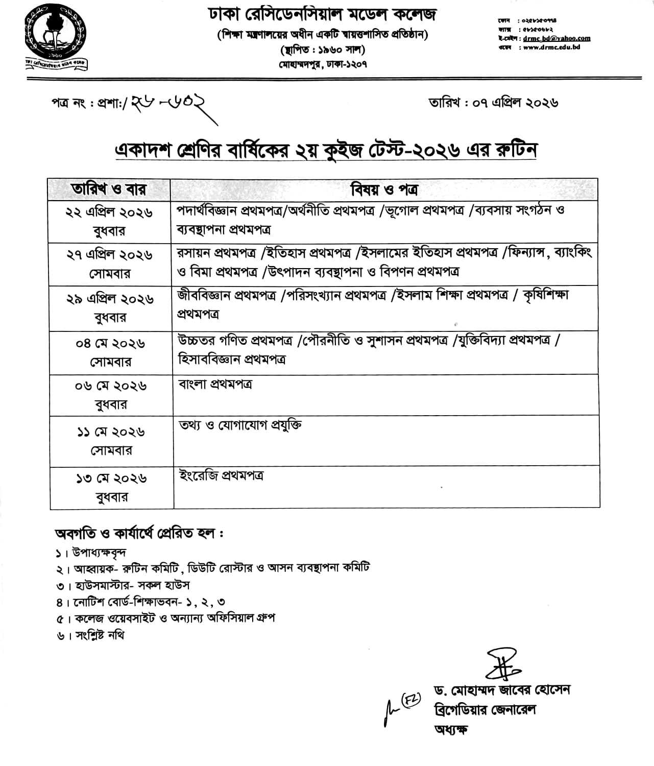 একাদশ শ্রেণির বার্ষিকের ২য় কুইজ টেস্ট-২০২৬ এর রুটিন
