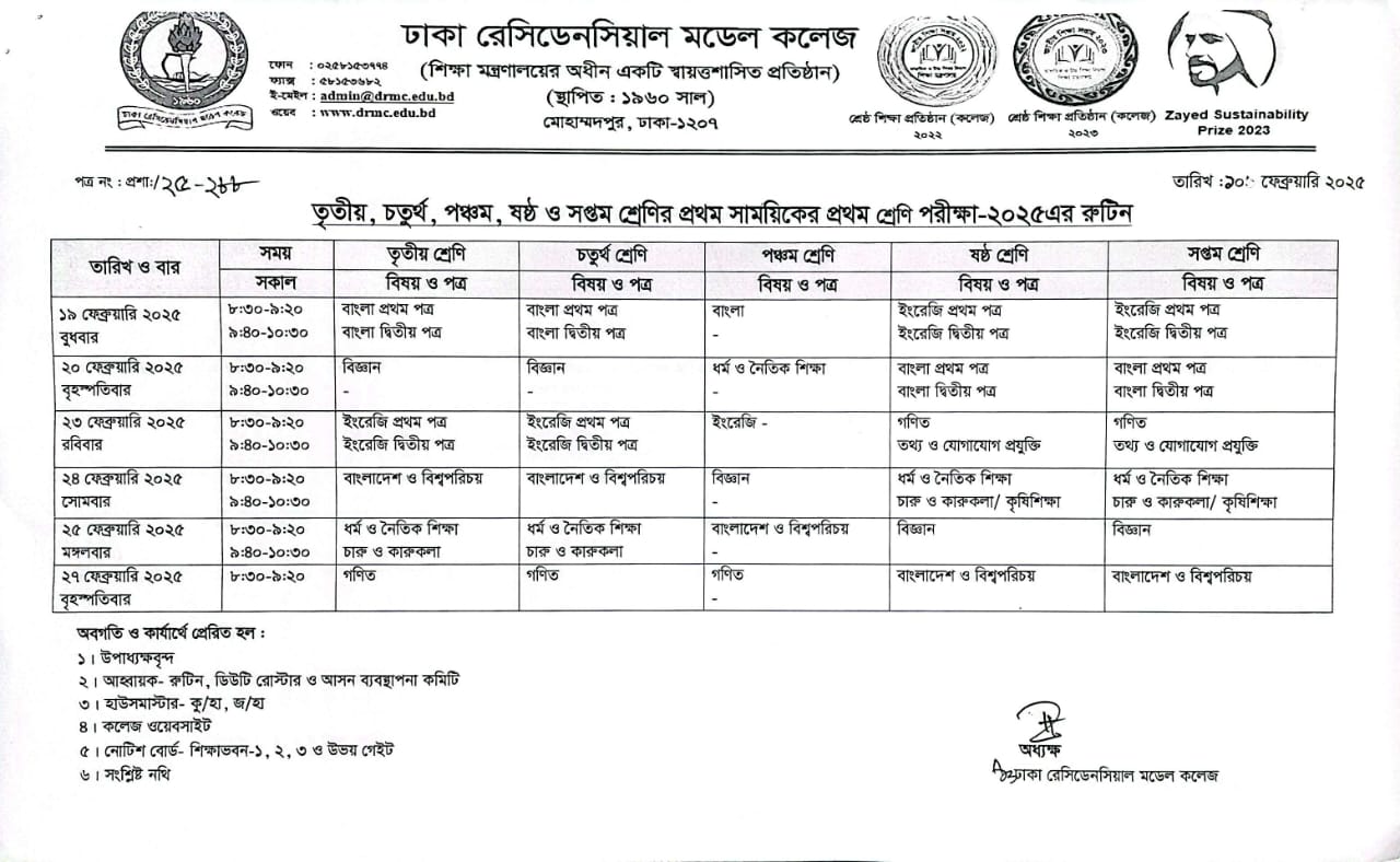 ৩য়, ৪র্থ, ৫ম, ৬ষ্ঠ ও ৭ম শ্রেণির প্রথম সাময়িকের প্রথম শ্রেণি পরীক্ষা-২০২৫ এর রুটিন